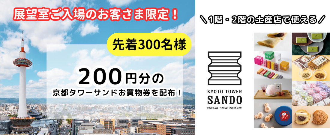 4月18日(土)にニデック京都タワー展望室ご入場のお客様へ京都タワービル1F・2Fの 京都タワーサンドで、お土産を購入の際に使用できる200円分のお買物券を配布いたします。